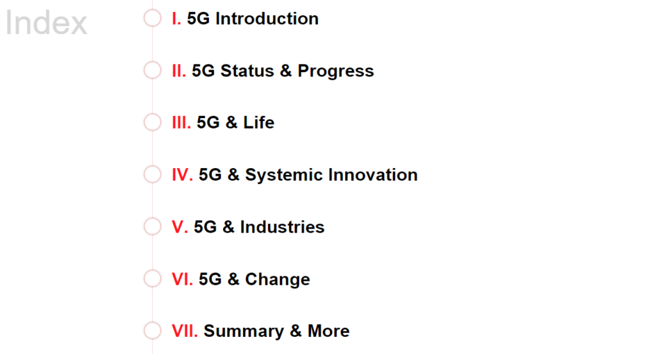 1. 5G Introduction에서는 5G에 대한 가장 기본적인 지식이자, 뒤에 나오는 현황, 삶 속 5G, 산업 속 5G, 사회 속 5G 등을 이해할 수 있는 기반이 될 내용임. "이 것만 알면 5G 80%는 이해할 수 있어요."